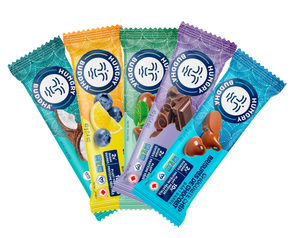 Fats blend (sunflower seed butter, cocoa butter, medium chain triglycerides coconut oil (coconut oil, acacia fibre), coconut oil*, sunflower oil), Inulin, Tapioca syrup fibre, Pea protein, Pea protein crisp (pea protein concentrate, brown rice flour), Water, Brown rice protein*, Glycerin*, Natural flavour, Blueberry, Agar, Monk fruit juice concentrate, Lemon, Sea salt, Sunflower lecithin, Mixed tocopherols. * Organic